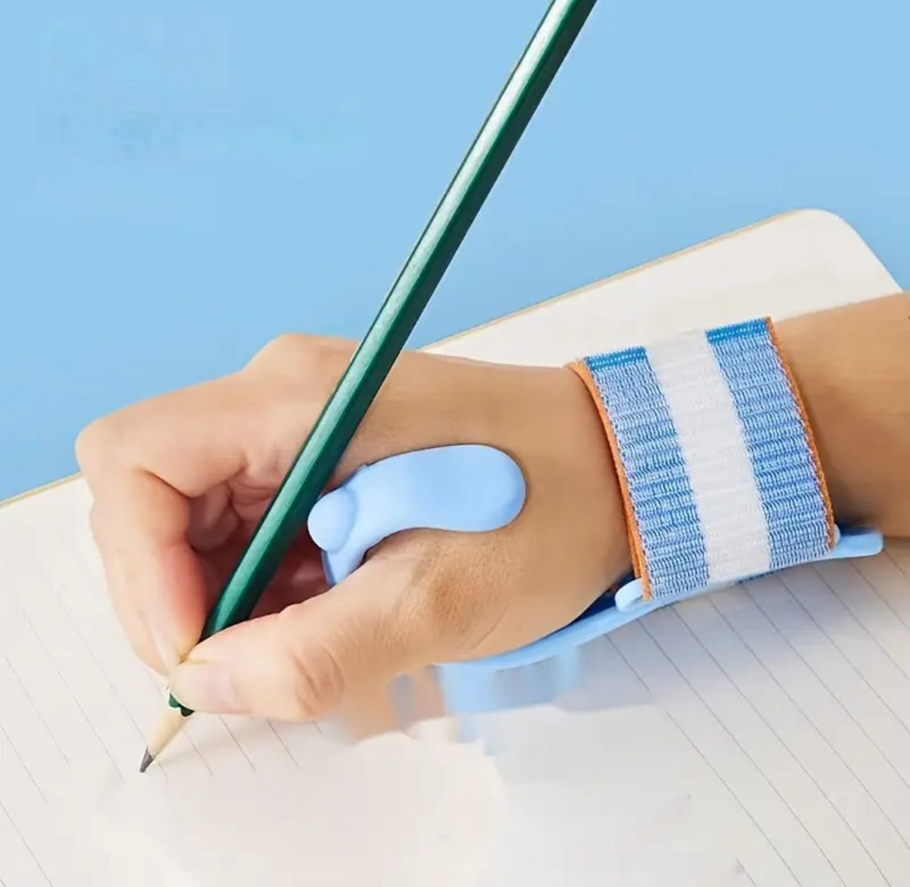 Diseño ergonómico con elástico ajustable para la muñeca, que facilita el agarre y la escritura, ideal para niños que necesitan mayor soporte.