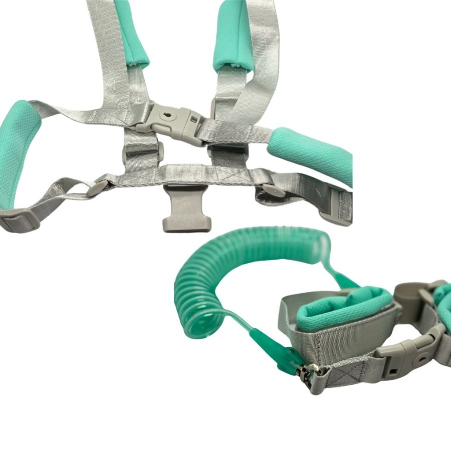 Arnés seguro con pulsera conectada a un cable extensible, pensado para evitar que los niños inquietos se pierdan en espacios públicos. Cómodo y fácil de usar.