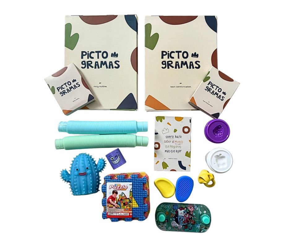 Incluye 4 cajas de pictogramas exclusivos Bluemom, ideales para anticipar rutinas, trabajar la comunicación básica y acompañar momentos de transición. Trae tubos corrugados grandes para estimular la atención, la respiración y el juego auditivo, masas para moldear que fortalecen la motricidad fina y ayudan a bajar la ansiedad, y un cactus o manza loco, perfecto para trabajar presión, fuerza de mano y descarga sensorial.
