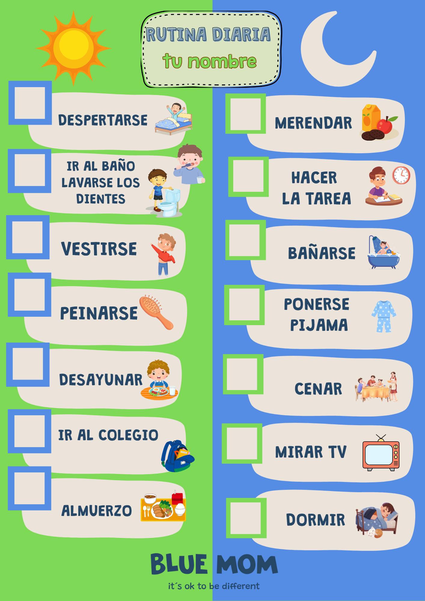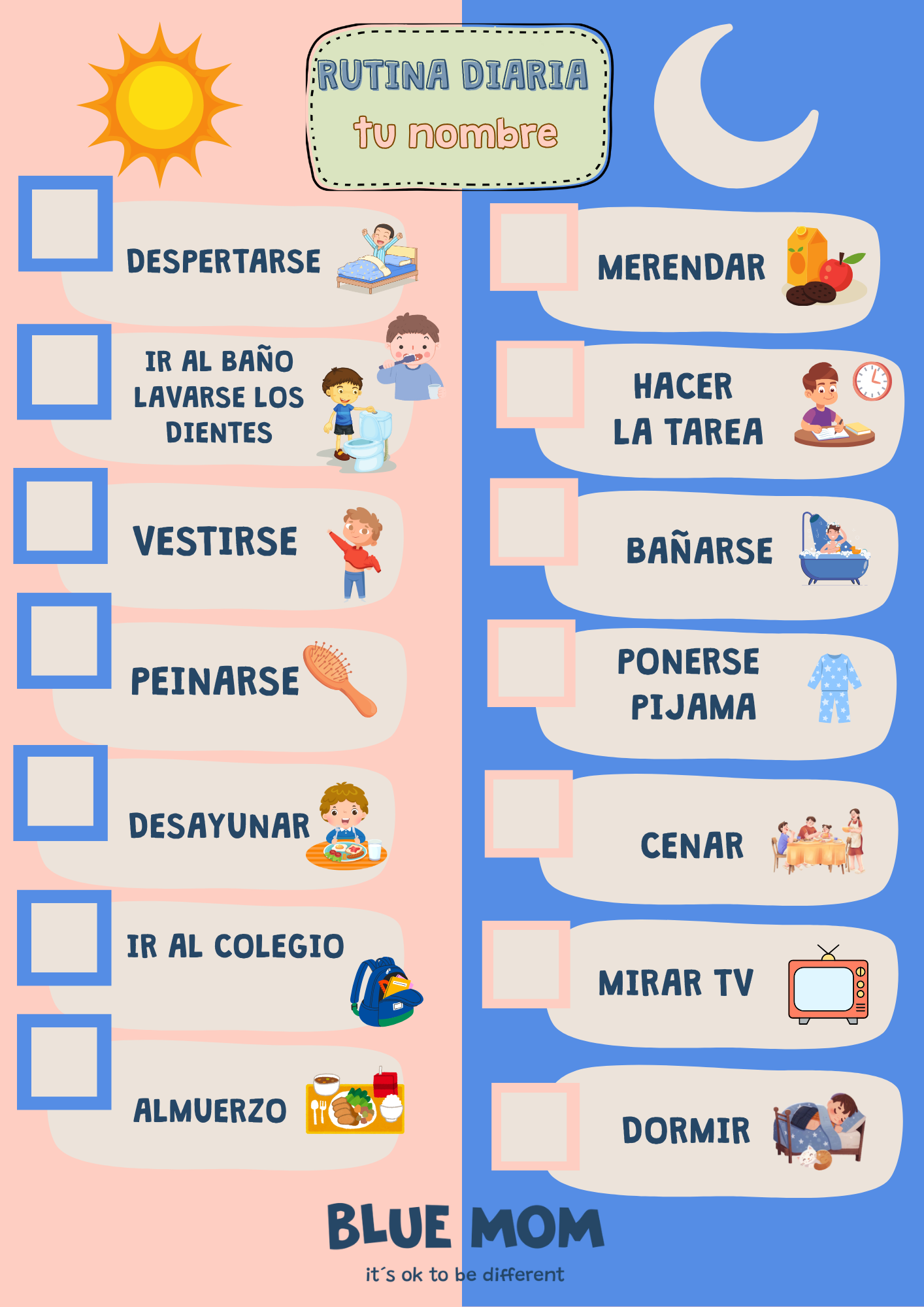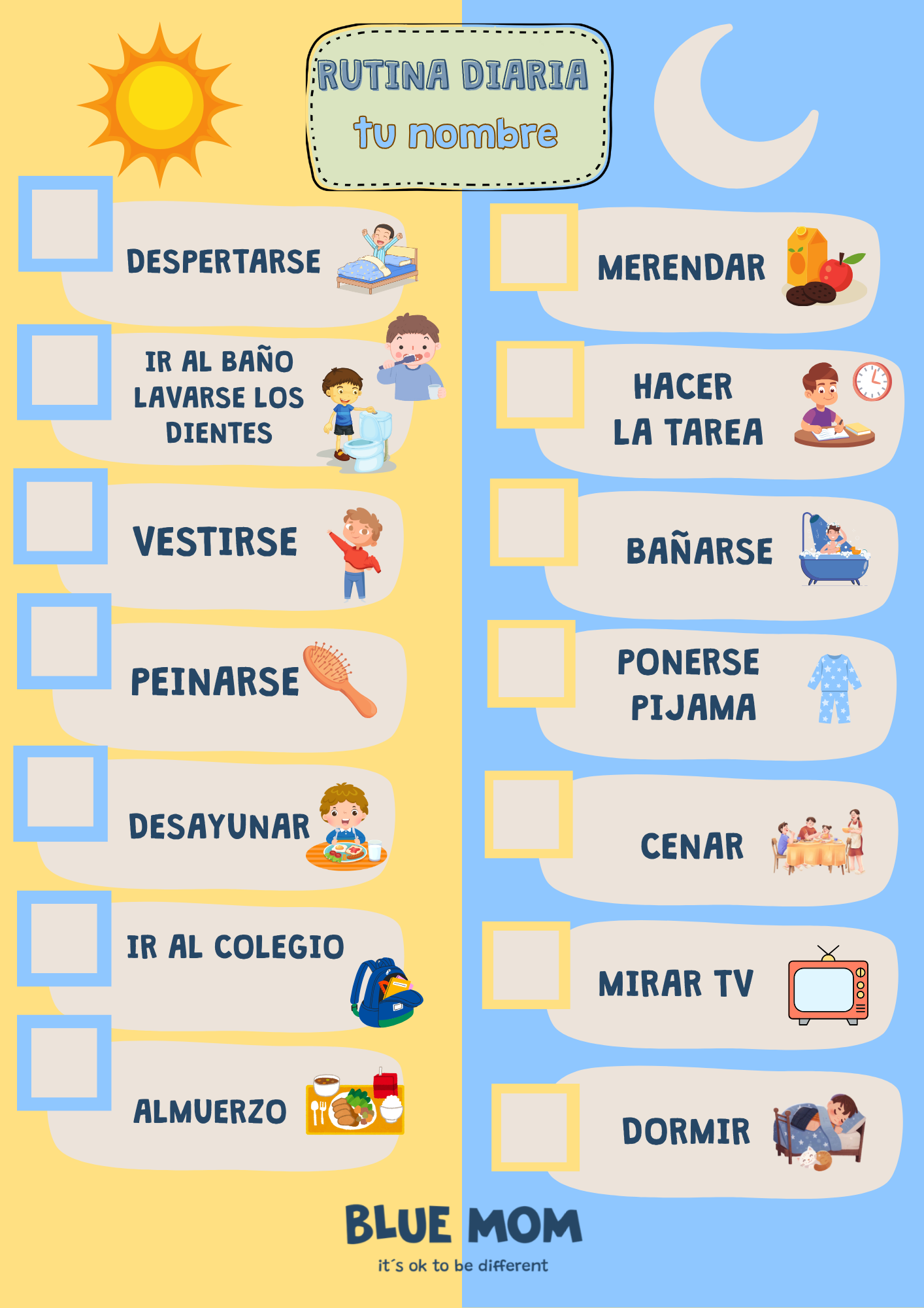 • Rutina diaria dividida en mañana y noche, con espacios para marcar cada tarea cumplida.